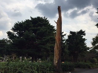 | 広大な敷地に延々と続く墓地、穏かな日差しの中をゆっくり歩いていると何とも 言えない不思議な気持ちになる。台風24号の爪跡はココにも、大木が 裂ける ように折れるほどの暴風が吹き荒れたということか・・・。掲示板として使われ ている折れた木の断面を見るとその樹齢に驚く。 | ||||||||||