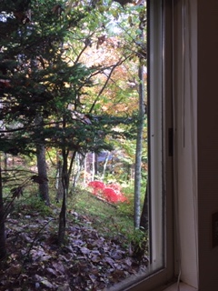 | 天気予報は雨だったけれど、お天気運の良い主人のおかげか爽やかな秋晴れの 朝。私の部屋からの眺めもすっかり秋、真っ赤に紅葉した紅葉が眩しい。 木々 の種類によって紅葉の濃淡が違い常緑樹の緑がアクセントになって・・・。自然 が織り成す美しいタブローを見るよう。 | ||||||||||