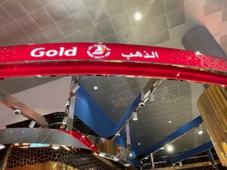 | 空港内の免税店は金ピカのインテリア、金のパームツリーとラクダの横には満艦飾のコーヒーセットやナツメの甘いお菓子、お祈りのための美しい絨毯のようなマットなど珍しいグッズが並ぶ。 ミルクチョコレートはラクダのミルク、車や不動産、金の延べ棒を売る免税店もあり驚く。 | |||||||||||||