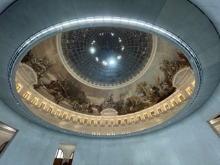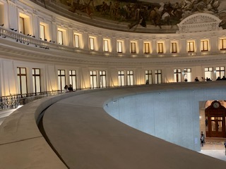 | 私が学生の頃はパリコレやモードの展示会場であった懐かしい場所。神殿のような建物の中に入ると自然光が差し込む巨大な吹き抜けに直径29メートル、高さ9メートルの円筒型の鉄筋コンクリートの構造が挿入されている。歴史的建造物とコンクリートに挟まれた空間を歩く不思議・・・。 | ||||||||||||||||