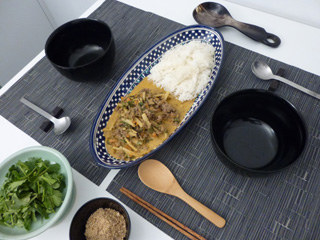 | タイ料理の香りやココナツミルクの風味はとても好きだけれど、辛いものが苦手 な私。タイに行った時には本当に困った。我が家のタイ料理はバナナや ココナ ツミルクでまろやかな味に。香草や胡麻もたっぷりトッピング。 | ||||||||||