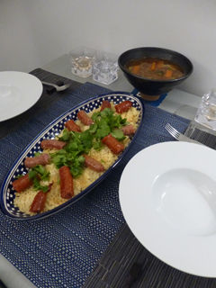 | お客様の多い我が家、クスクスは人数が増えてもスムール(クスクスの粒)を蒸 らせばスグに出来るのですっかり定番になっている。トッピングもケバ ブ風肉 団子や、スパイシーなチキンなどバリエーションも楽しめる。今晩はイカのター メリックソテーを添えて。イスラム文化の影響が色濃く残るスペ インのテルエ ルと言う街で買った美しい陶器のお皿、クスクスを作る度にスペインの街を思い 出す。 | ||||||||||