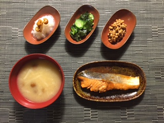 ヨーロッパに居ると「和食」ほど体に良いお食事は他にないのでは?と思う。 発酵食品であり植物性タンパク質の納豆、ミネラルたっぷりの海 草に三 杯酢、消化酵素そのものの大根おろしにムチンたっぷりのなめこを乗せたなめこ おろし、大根となめこのおみおつけ、美肌効果バツグンの鮭の照 り焼 き・・・。全てに美容健康成分たっぷり!元気に夏を乗り切りたいもの。