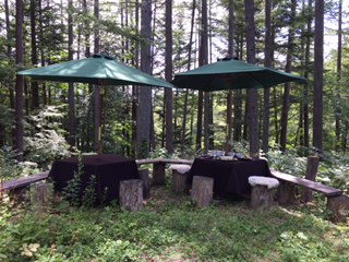 | 晴れていても午後に一度は雷雨のある最近の軽井沢、珍しく晴天が続いて毎日テ ラスでランチを頂ける幸せ!と思っていたら。気持ちの良いお天気は蜂 も同 じ、あっという間にブンブンと蜂がテーブルに。お皿を下げようにも蜂を避けつ つ、少しずつ・・・、ランチが終ったらもうヘトヘト。 | ||||||||||