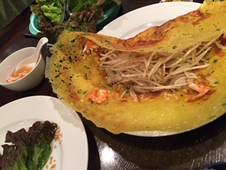 | 長いお付き合いのCAの友人達と久しぶりに東京で会う。パリではポピュラーな ヴェトナム料理、香草の香りも懐かしくまるでサンジェルマンに居るよ う。生 春巻きや青パパイヤのサラダ、黄色い扇のようなヴェトナム風クレープバインセ オ、とまずはクラシックなメニュウをチョイス。レタスにさまざ まな香草を載 せ、サクサクしたとうもろこしの食感が香ばしいクレープを巻いて頂く。濃厚な アボカドのスムージーはほのかな甘さが爽やかなヴェトナ ム料理にぴったり。 | ||||||||||||||||