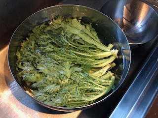 昨年の緊急事態前言時の外出自粛期間にトライして以来すっかり我が家の定番メニュウになった「サンマの酢煮」。青魚のEPAとDHAを丸ごと摂るには煮汁も大切とカブの葉や小松菜などカルシウムたっぷりの温かい葉野菜を浸して。香ばしいすりごまとお酢で匂いも気にならない。 |