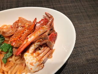 以前良く通っていたイタリアンのお気に入りメニュウ「ワタリガニのリングイネ」を我が家で再現、カニをソテーする間にも香ばしい香りがキッチンいっぱいに広がりリストランテ気分、モチモチの生パスタを合わせてフレッシュなバジルをトッピング。カニの旨味がたっぷり溶け込んだトマトソースはリゾットにしても美味しそう。 |