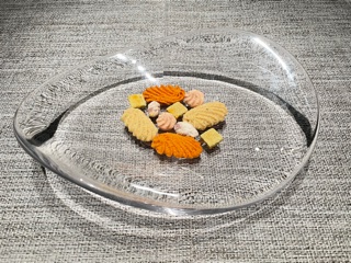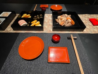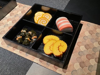 | 今年もお節は義母からの頂きもの、お重に詰め並べるのが私の役・・・。情けないと思いつつ、義母の丁寧な味に舌鼓。干し柿と酢蓮、柚子の香りのなますにゴマメ、栗きんとんとニシンの昆布巻、どれもとても美味しい。紅白の蒲鉾や伊達巻など、お節料理は色や形もグラフィカル。 | ||||||||||