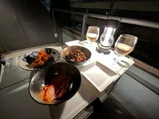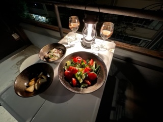 | ようやく暖かくなってテラスでゆっくりディナーが出来るように。ワゴンテーブルにはサラダやピザなどシンプルなメニュウと冷えた白ワイン、爽やかな5月の風に吹かれてゴキゲンなテラスディナー。 | |||||||