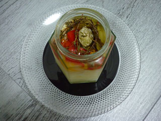 友人からお手製のピクルスを頂く。タマネギと赤・黄のピーマン、お庭からのハーブも。芸術的で食べてしまうのが惜しい・・・。