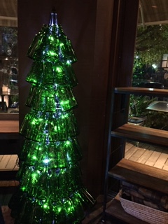クリスマスのイルミネーションやツリーが溢れるこの季節、ジンジャーエールの ボトルで出来た面白いクリスマスツリー。内側に取り付けた小さな点滅 する電 球がキラキラ光り レストランの素敵なインテリアに。私も自分で作ってみたい・・・。 |