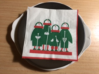 | 母が残してくれたクリスマスのテーブルセッティング用のグッズ、どれも懐かし く大切に使っている。エンジェルの聖歌隊かと思ってよく見ると、サンチャゴ・デ・コンポステラへ の巡礼者のよう。可愛らしくも敬虔なクリスチャン・ナプキン。 | ||||||||||