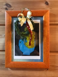 軽井沢の隣人は素敵な木の香りのするお宅にお住まい。久しぶりにお尋ねすると母の作品の絵葉書が額に入って飾られている。魔除けの唐辛子と小さなリースも可愛らしく母がそこに居るような気がして嬉しい。 |