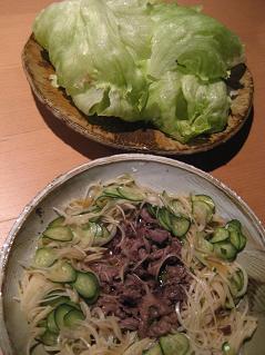 パリではやっぱりお肉メニューをチョイスすることが多いけれど、日本の和牛の薄切りも捨てがたい! 主人はあまりゴツイ(?)お肉を頂かないので、日本酒たっぷりのお湯にくぐらせた「牛しゃぶ」は我が家の定番。たっぷりのたまねぎを薄きりにして甘酢に漬けておいたものと一緒にレタスにくるんで頂く。 お野菜も沢山いただけるのが嬉しい。 |